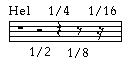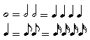 Vi sa att varje notvärde är hälften så stort som det föregående. Det innebär (som du ser på bilden ovan) att en helnot är lika lång som två halvnoter eller fyra fjärdedelsnoter. Du ser också att en fjärdedelsnot är lika lång som två åttondelsnoter eller fyra sextondelsnoter. Av detta följer att en helnot är lika lång som åtta åttondelsnoter eller sexton sextondelsnoter.