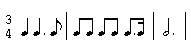Vi har tre fjärdedelstakt. Varje takt ska alltså innehålla värdet av tre fjärdedelar. Den första takten innehåller en fjärdedel, en punkterad fjärdedel (dvs 1/4 + 1/8) och en åttondel. Nästa takt innehåller fyra åttondelar, en punkterad åttondel (dvs 1/8 + 1/16) och en sextondel. Sista takten innehåller en punkterad halvnot (dvs 1/2 + 1/4).