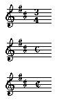 När man skriver ut taktarten i noterna använder man inget bråkstreck. Vi har ju redan notlinjerna. Här nedan ser du tre exempel på skrivsätt, först vanlig 3/4. Sedan ser du något som är ganska vanligt, att man i stället för 4/4 skriver bokstaven ”C”. Det tredje exemplet med det genomstrukna C:et kallas à la breve. Det är 4/4 men ska räknas med två slag i takten.